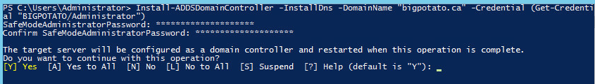 Install-ADDSForest -DomainName "bigpotato.ca"- This will create a domain called bigpotato.ca, so replace this with your own domain name