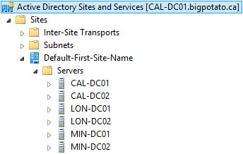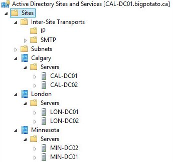 In this section, we will configure Active Directory Sites and Services so that the servers in our domain appear in the correct sites. We will create three sites: Calgary, London, and Minnesota, subnets associated with each site, and inter-site transports which will make the link between London and Minnesota a backup link.