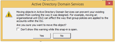 After the sites are created, we need to move the servers to the correct locations. This is a simple matter of dragging and dropping the servers to other containers. Try dragging MIN-DC022 to the "Servers" folder in Minnesota. You will get a warning telling you that moving the server may affect group policies. The warning looks like this: