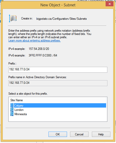 In order to create these subnets, you will need to right-click on the "Subnets" folder and select "New Subnet…". Enter the prefix using network prefix notation, as instructed. Then, select the appropriate site object for the prefix. In our case, 192.168.77.0/24 is used for Calgary. Your entries should appear similar to this: