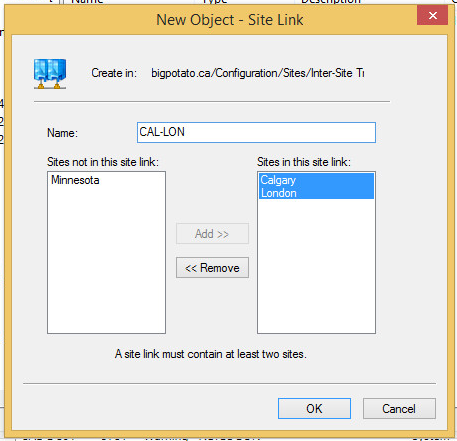 After making the change, make sure to click "OK". Now that the cost is lower, the servers will prefer to use the CAL-LON and CAL-MIN links for replication.