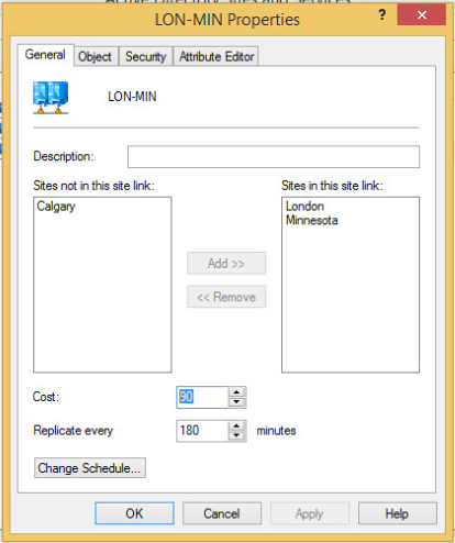 We're going to create site links between Calgary and London, Calgary and Minnesota, and London and Minnesota. For the purposes of this report, we're going to make the London-Minnesota link the "back-up" link, and make sure that Active Directory mainly replicates using the links to Calgary.