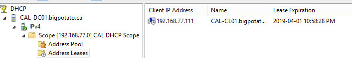 To create the reservation from DHCP Manager (open it via Server Manager), we need to get the MAC address for our client. To do that, make sure the client is obtaining its IP address and DNS servers automatically (it will get it from the DHCP server we just configured). The client should then appear under Address Leases in DHCP Manager, like so: