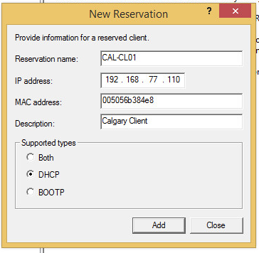 Next, we're going to create DHCP reservations. For our environment, we want all our Windows Clients to obtain the IP address X.X.X.110, depending on the location. For example, CAL-CL01 will always get 192.168.111.110.