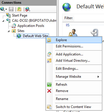 Open the IIS Manager by right-clicking on CAL-DC02 in Server Manager > IIS. When you open the file tree, you should see "Default Web Site" under sites. Right-click on it and select "Explore", like so: