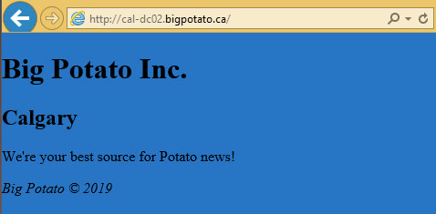 On a client computer, you'll be able to access the website via the URL CAL-DC01.bigpotato.ca for now. We will create a DNS alias to give that a more user friendly name later. Regardless, you should be able to see the lovely website we created.