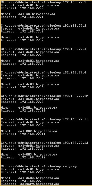 Add-DnsServerResourceRecordCName -Name "calgary" -HostNameAlias "cal-dc02.bigpotato.ca" -ZoneName "bigpotato.ca"Testing with nslookup
