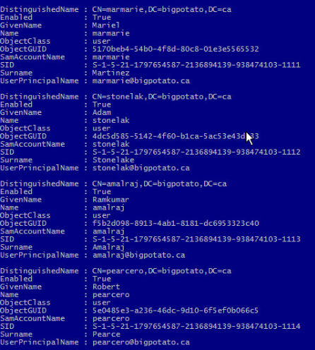 New-ADUser pearcero -UserPrincipalName "pearcero@bigpotato.ca" -GivenName Robert -SurName Pearce -DisplayName "Robert Pearce" -Path "DC=bigpotato,DC=ca" -AccountPassword (ConvertTo-SecureString -AsPlainText Secret123 -Force) -ChangePasswordAtLogon $true -Enabled $trueWe can confirm that our users were created by running the command Get-ADUser -Filter * and the output should include the users we created: