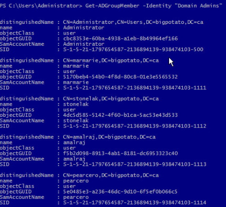 Add-AdGroupMember -Identity "Domain Admins" -Members pearcero,marmarie,stonelak,AmalrajWe can confirm that our users were added to the group by running Get-AdGroupMember -Identity "Domain Admins":