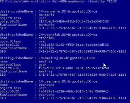Add-ADGroupMember -Identity TECHS -Members pearcero,marmarie,stonelak,AmalrajYou can confirm that the users were added to this group with the command Get-ADGroupMember -Identity TECHS: