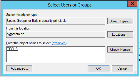 In the objects section, enter "techs" and click "Check Names". The object for the TECHS security group should appear, like so: