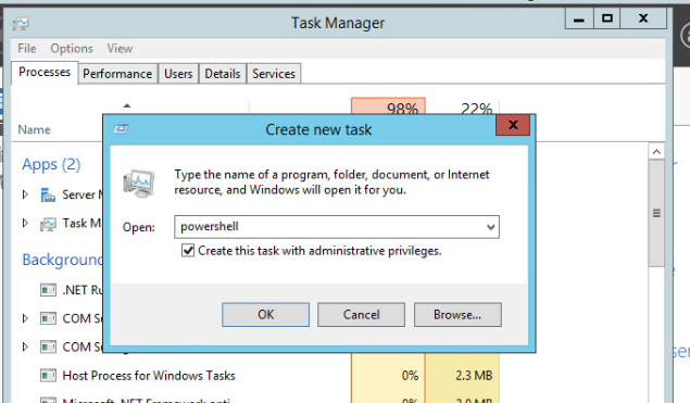 Run PowerShell as an Administrator and elevate User Account Control permissions, if prompted. You can do this by clicking on the taskbar shortcut on Windows Server 2012.