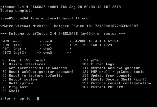 The particular environment that I have uses pfSense. For my environment, I will need to configure the pfSense router in order to set the foundation for the rest of my network. The following images shows the welcome screen for pfSense after bootup: