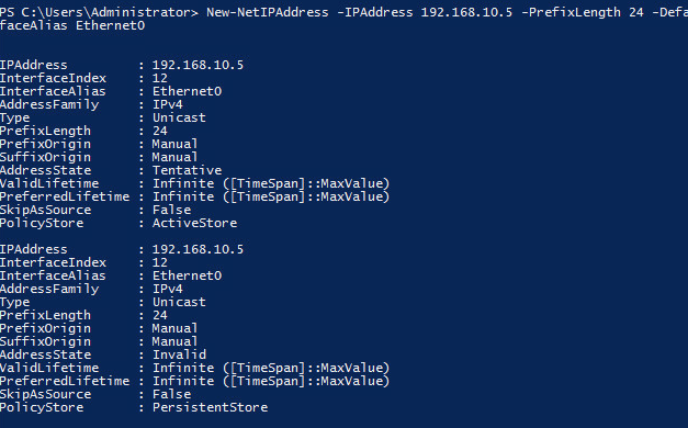 New-NetIPAddress -IPAddress 192.168.10.5 -PrefixLength 24 -DefaultGateway 192.168.10.1 -InterfaceAlias Ethernet0You should have the following output: