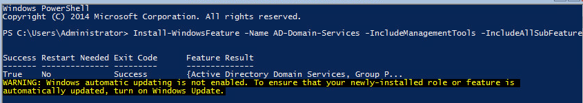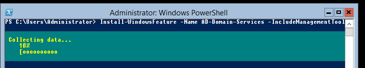 Install-WindowsFeature -Name AD-Domain-Services -IncludeManagementTools IncludeAllSubFeaturesThis command will then display a progress screen like this: