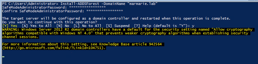 Install-ADDSForest -DomainName "marmarie.lab"After entering either -ADDSForest command above, you will need to enter a Safe Mode Administrator Password. Do so, and make sure that it is both secure and something that you can remember. You should then see something like this: