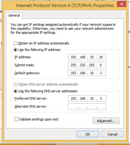 The IP address for the client computer in this report will be 192.168.10.10. It will use the same default gateway as the server (192.168.10.1), and use the Windows 2012 Server as its DNS server (recall that its IP address is 192.168.10.5). Enter that information like so: