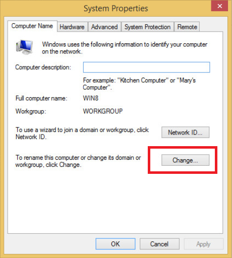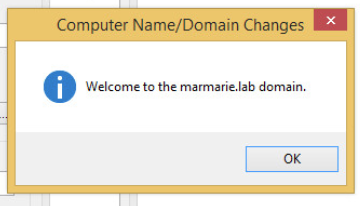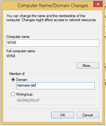 In the window that appears, you can change your computer name (mine is WIN8). But the important bit is to select "Domain:" under the section "Member of", and enter the name of your server's domain (in my case marmarie.lab).