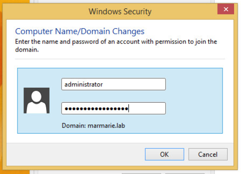 Click OK, and you will be prompted to enter administrator credentials to give your client permission to join the domain. Enter "administrator" for the user name, and the administrator password for your Windows Server (not your client).