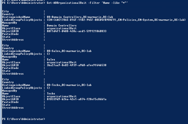 'Name -like "Sales"'). Learn more about this command on Microsoft's documentation website (https://docs.microsoft.com/en-us/powershell/module/activedirectory/get-adorganizationalunit?view=winserver2012-ps).Here is what my output for that command looks like after creating my organizational units:
