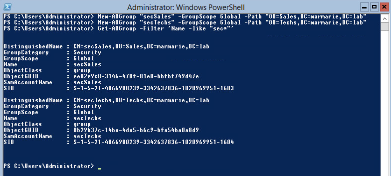 New-ADGroup "secSales" -GroupScope Global -Path "OU=Sales,DC=marmarie,DC=lab"New-ADGroup "secTechs" -GroupScope Global -Path "OU=Techs,DC=marmarie,DC=lab"Similar to when we created the organizational units, executing these commands should give no output. Otherwise, an error has occurred.