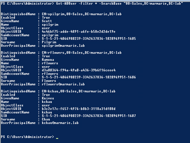 Get-ADUser -Filter * -SearchBase "OU=Sales,DC=marmarie,DC=lab"