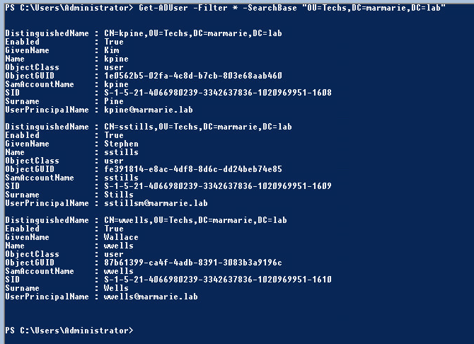 Get-ADUser -Filter * -SearchBase "OU=Techs,DC=marmarie,DC=lab"